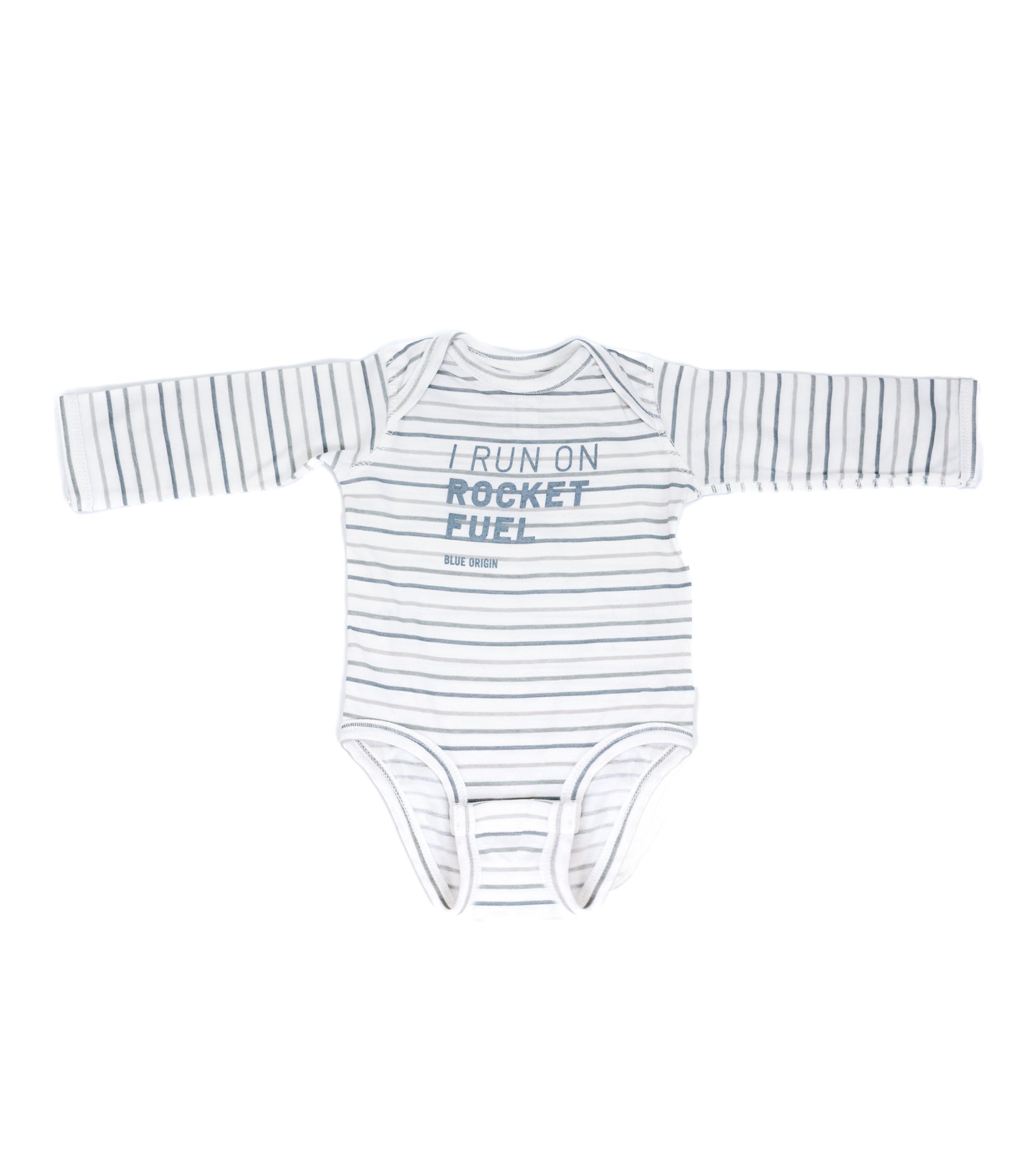 Striped long sleeve onesie. Ribbed cuffs at collar, legs and sleeves. Snap tape closure at leg opening. Features “I run on rocket fuel” word graphic on front. Made of 100% combed ringspun cotton jersey. Gender neutral fit.