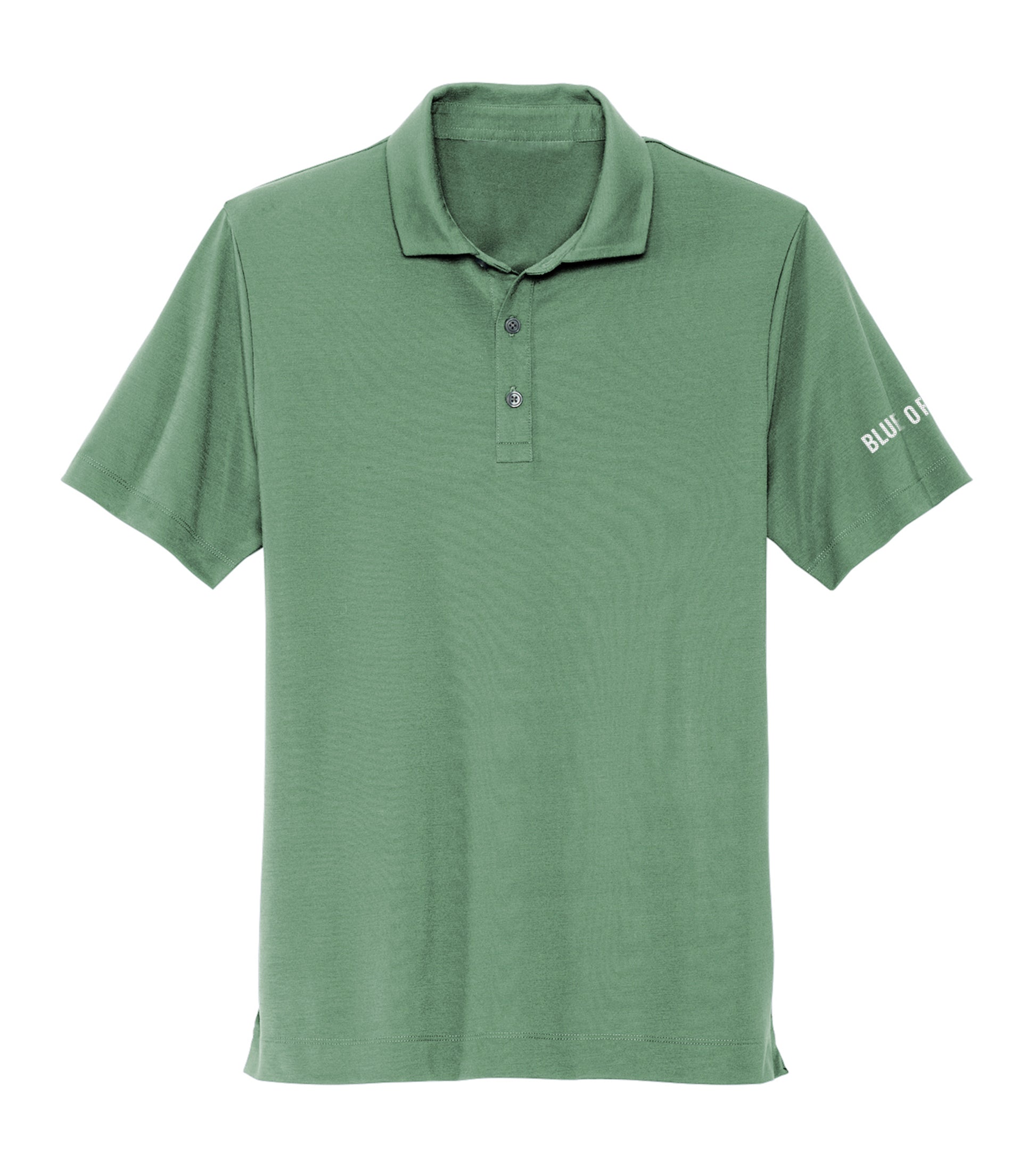 Soft feel moisture-wicking polo with three button placket and feather on left chest. Made of 92% poly and 8% spandex jersey. Men's fit.