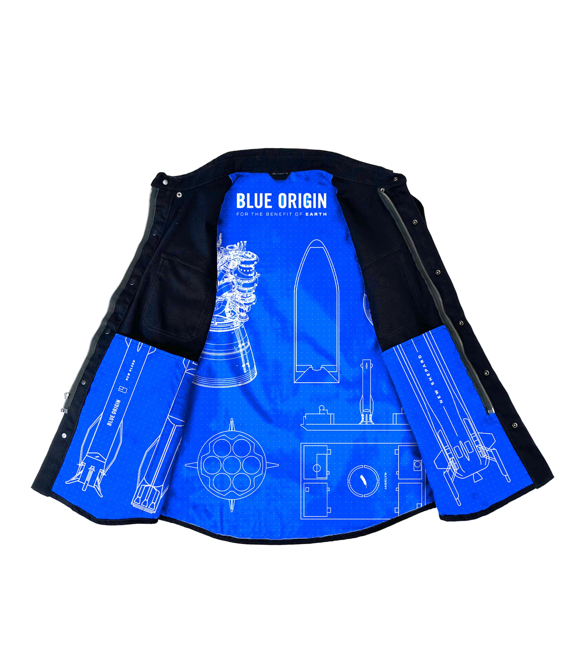Custom work shirt style jacket features canvas shell with Blue Origin embossed leather patch, black anti-scratch snaps with feather, large hand pockets, snap closure chest pockets, and two interior pockets. Lined in blue vintage bandana feel fabric with Blue Origin vehicle graphics. Made of 12oz American canvas shell. Made in the USA. Men’s fit.