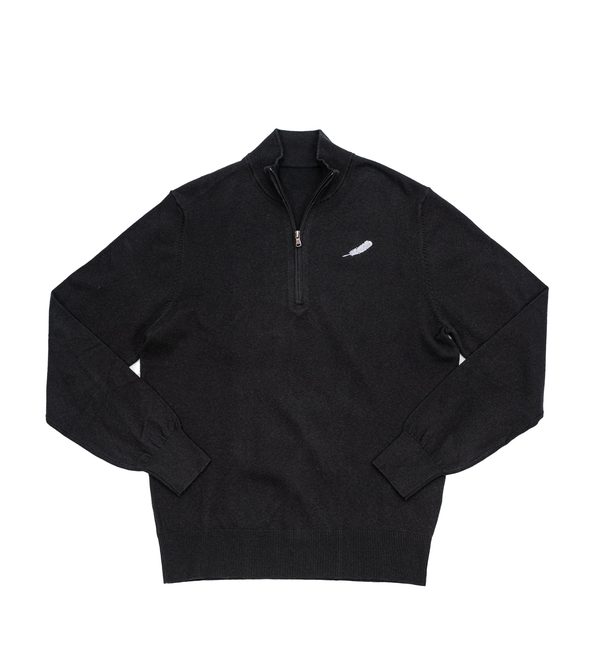 Lightweight 1/4 zip sweater with rib knit collar, cuffs, and hem. Features embroidered feather on left chest and antique silver zipper pull. Made of 56% cotton, 29% nylon and %15 acrylic. Men’s fit.