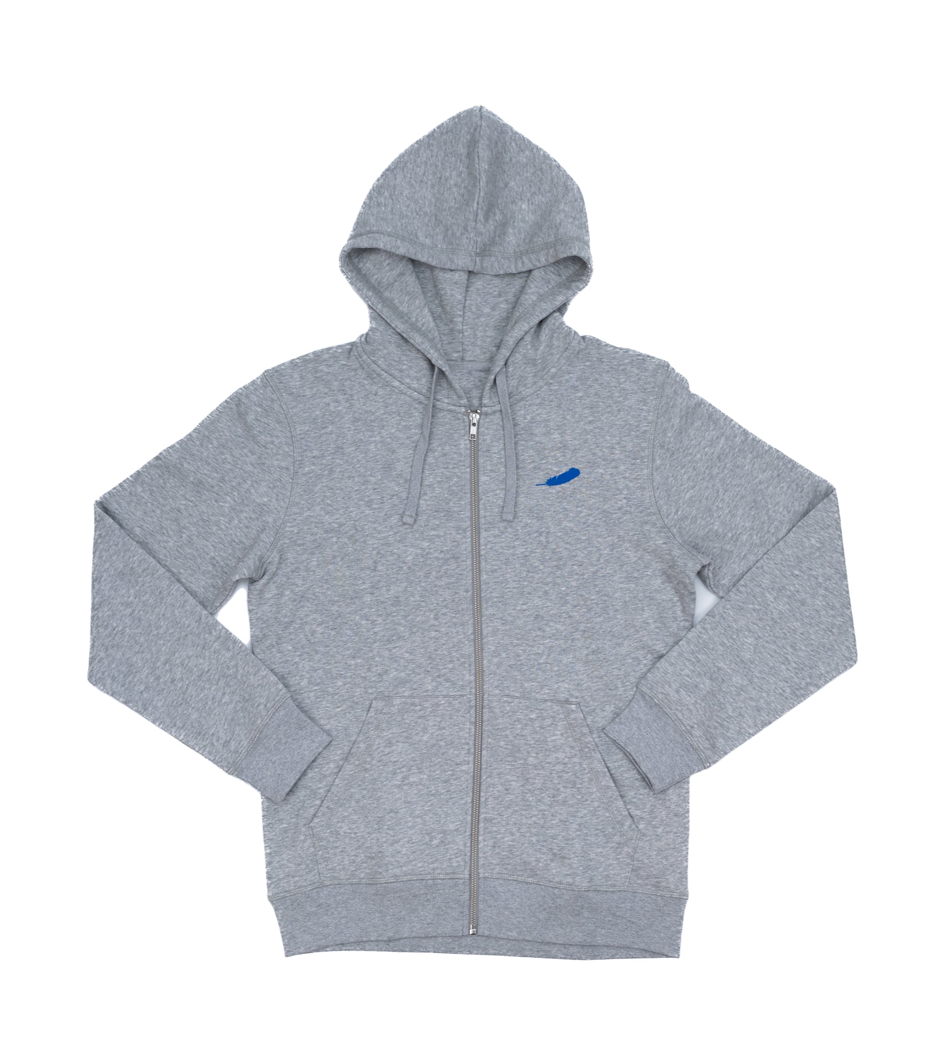 Full-zip hoodie with New Glenn graphic on back and feather on left chest. Features tonal drawcord, front pouch pockets, and triple-needle topstitch seems. Made of 80% organic ring-spun cotton and 20% recycled polyester brushed 3-end fleece. Gender neutral fit.