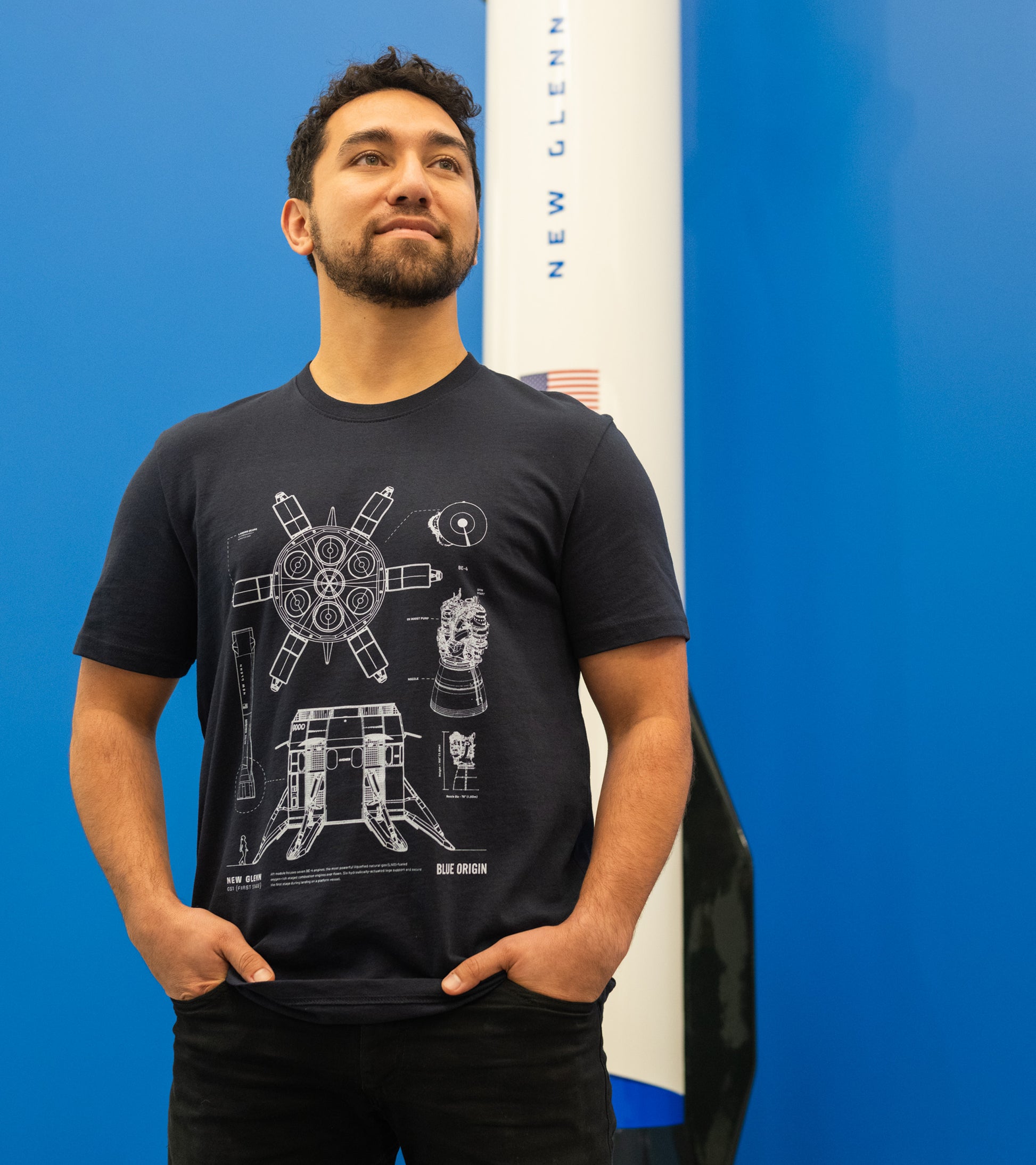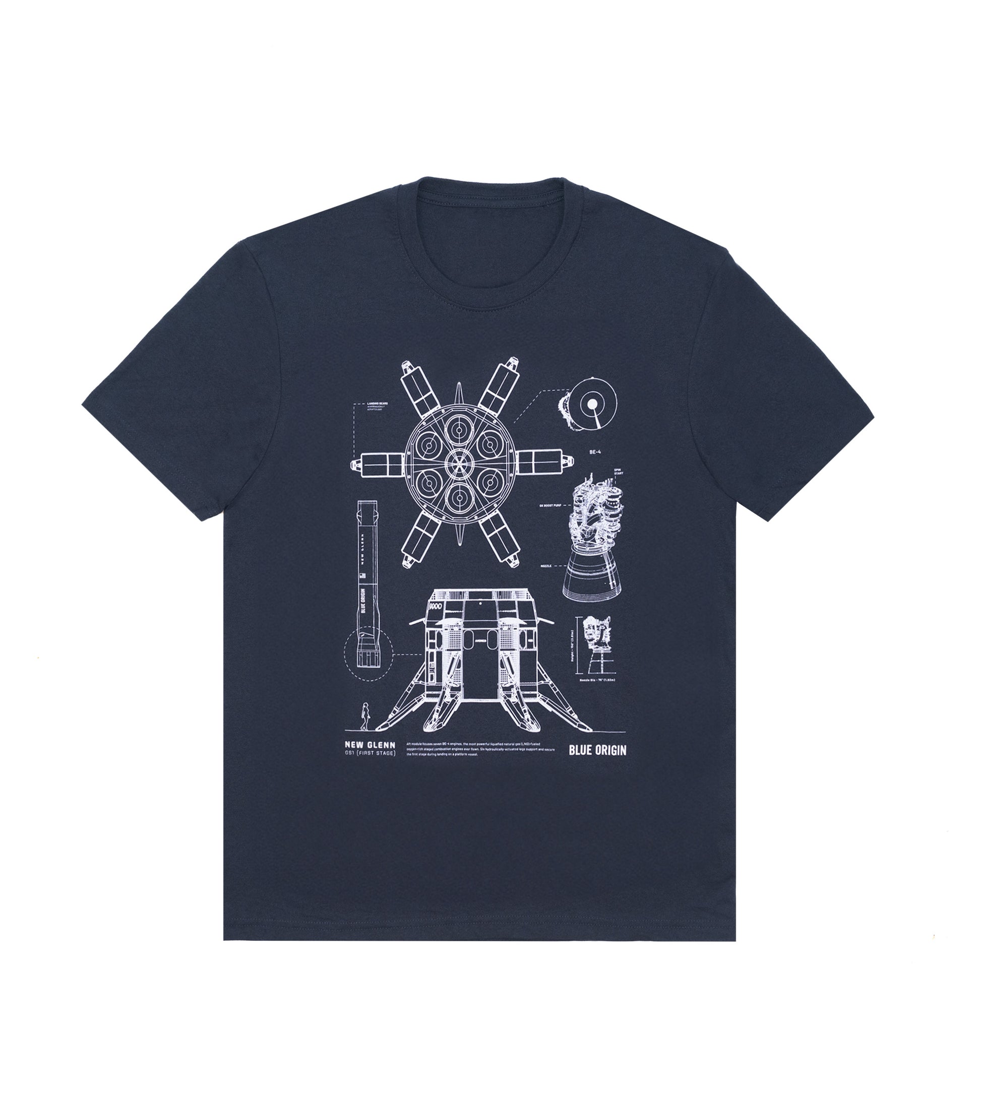Featuring a New Glenn technical drawing. Soft tee made from 60% recycled cotton and 40% recycled polyester. Carbon neutral product. Gender-neutral fit.