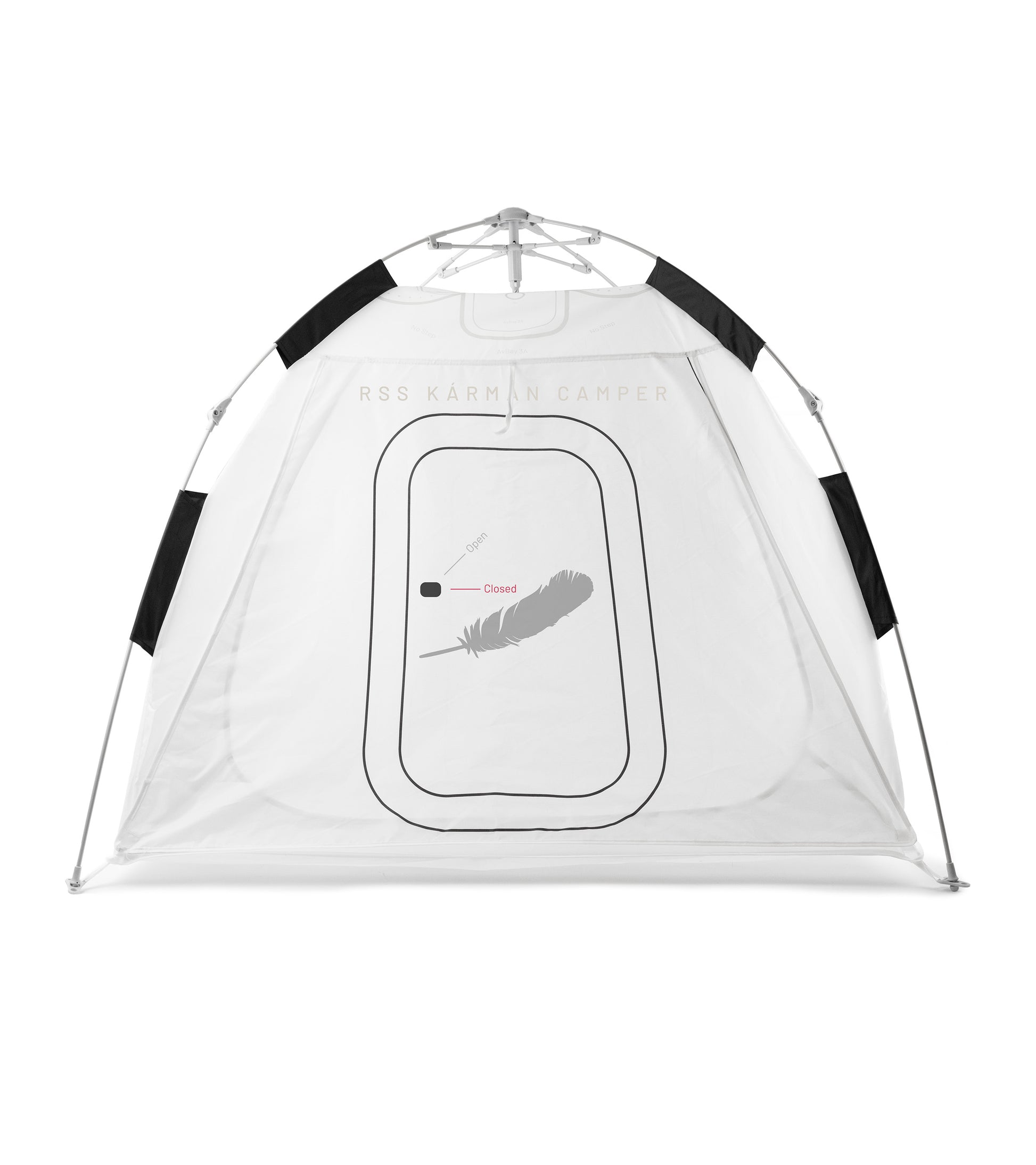 Play tent features New Shepard Crew Capsule elements printed on 4 walls, mesh windows and a rollup door. Comes in a carry tote. Setup size: 47.25”W x 47.25”L x 41.34”H.