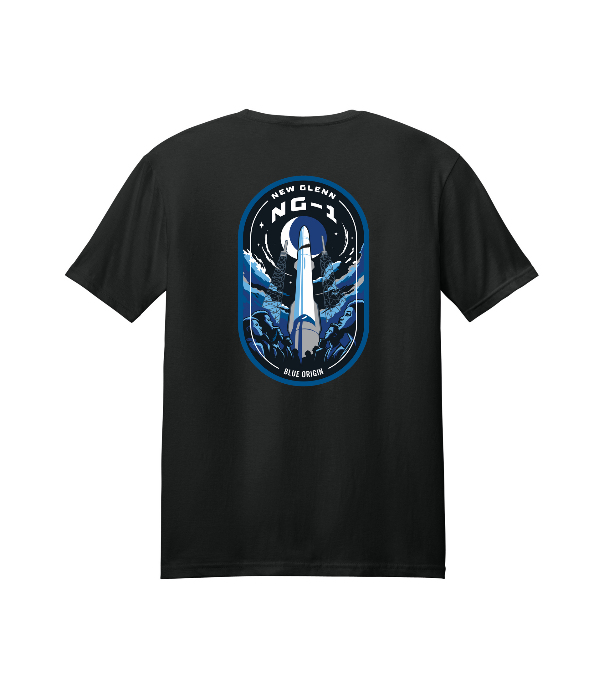 Soft, cotton tee with NG-1 graphic on back and New Glenn wordmark on front. Gender neutral fit.