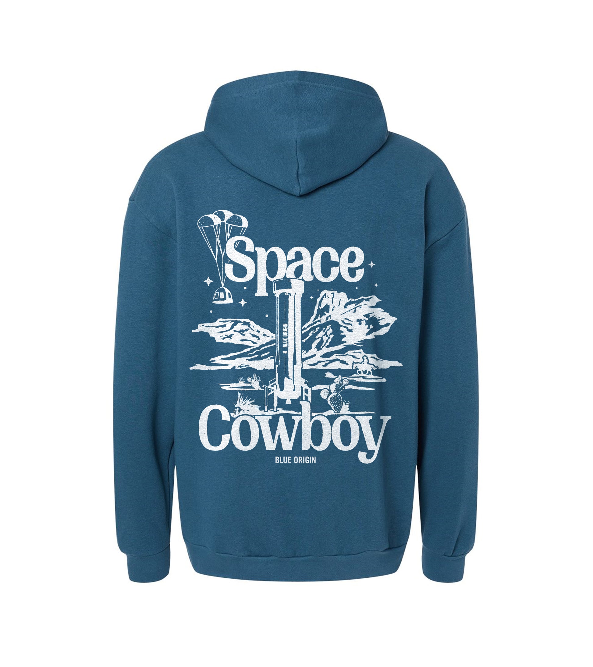 Soft drawcord free hoodie featuring oversized Space Cowboy graphic on back. Made of 70% U.S. combed ringspun cotton and 30% recycled polyester. Gender-neutral fit.