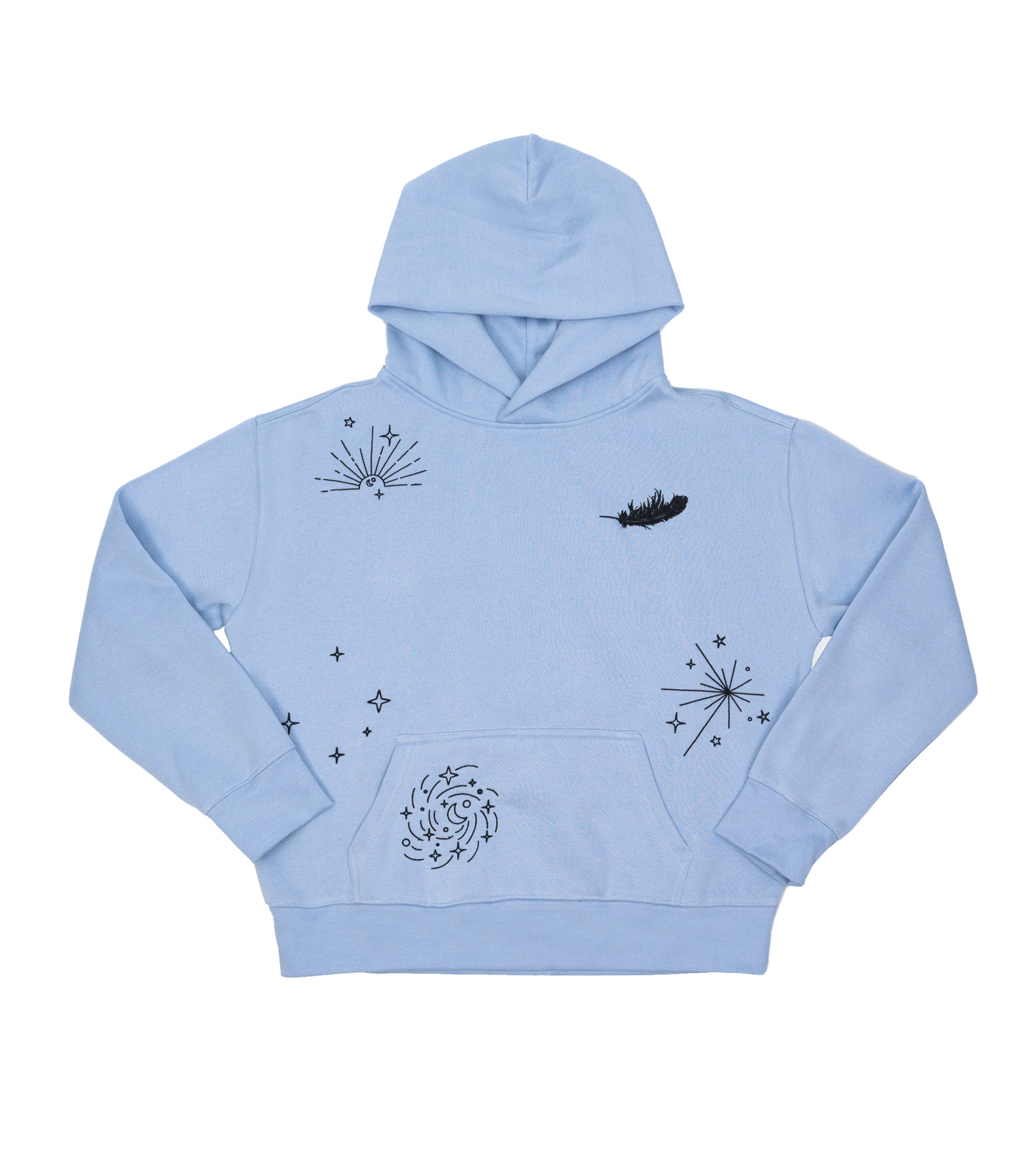Soft cordless hoodie with drop shoulders, a pouch pocket, and ribbed sleeve cuffs. . Features embroidered cosmic designs throughout and a wild feather on the left chest. Made of 80% cotton and 20% polyester CVC fleece. Women’s fit.