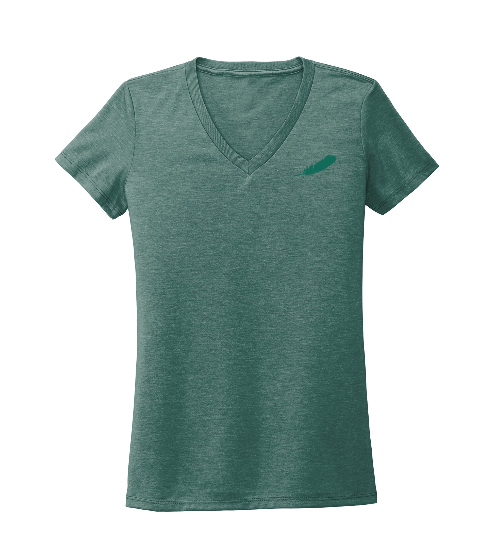 Soft feel, deep-sea green heathered V-neck tee with tonal feather on the left chest. Made of 50% recycled fabric, 25% organic ring spun cotton, and 25% modal. This item is carbon-neutral. Women's fit.