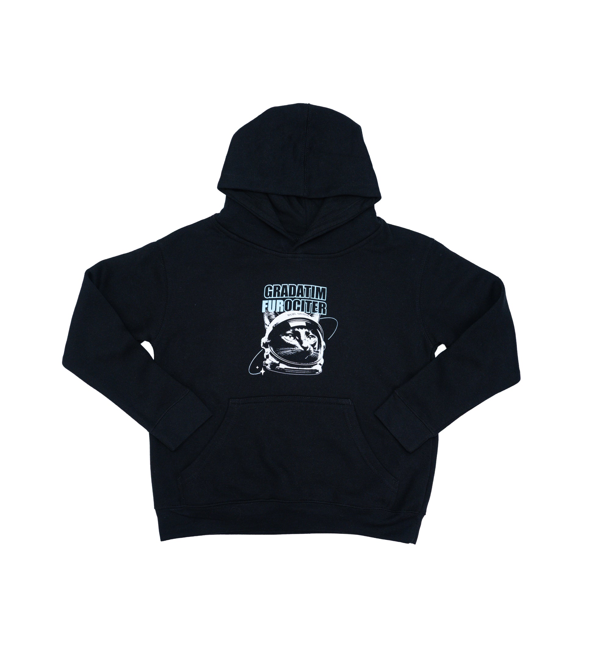Soft hoodie with front pouch pocket, jersey-lined hood, and ribbed cuffs & bottom band. Featuring “Furociter” graphic on front. Made of 60% cotton and 40% polyester fleece. Gender neutral youth fit.